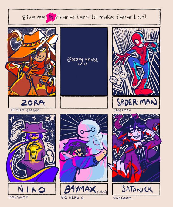six (five) fanarts time!! i tried this challenge back in 2020 and never finished it, but this year i got a new batch of characters and tried again!! [#sixfanarts #epitheterased #spiderman #oneshot #oneshotgame #okegom #funamuseart]