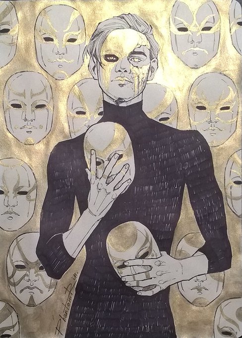 Day 26 - Pretender #inktober #inktober2019 #pretender #mask #guy #faces #art #illustration #traditional #ink #gold #original #PhantomRin