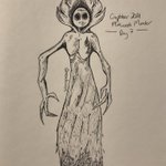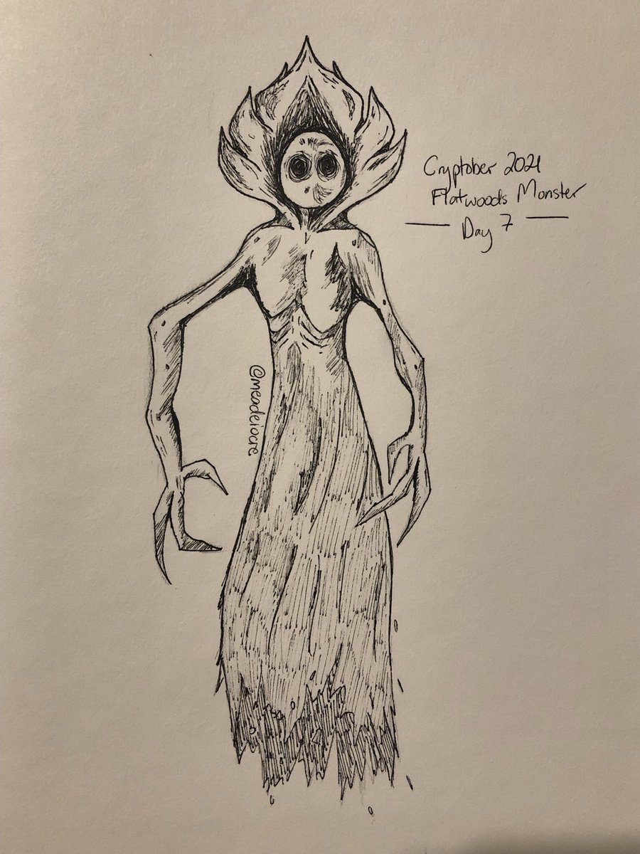 “…a tall creature with a head shaped like a spade and twisted, clawed hands appearing to levitate off the ground…” #cryptiber2021 #inktober2021 #flatwoodsmonster