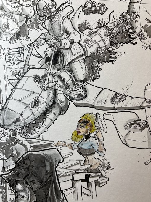 I’m going back to work on the #inktober #steampunk piece for the #flightoftheterrapin #steampunkairship #art #sketch #drawing #illustration #doodlebags #nashville #nashvilleart #digital #characterdesign #steam #steampunkturtle #fantasyarchitecture #longboats #ink #inktober2021