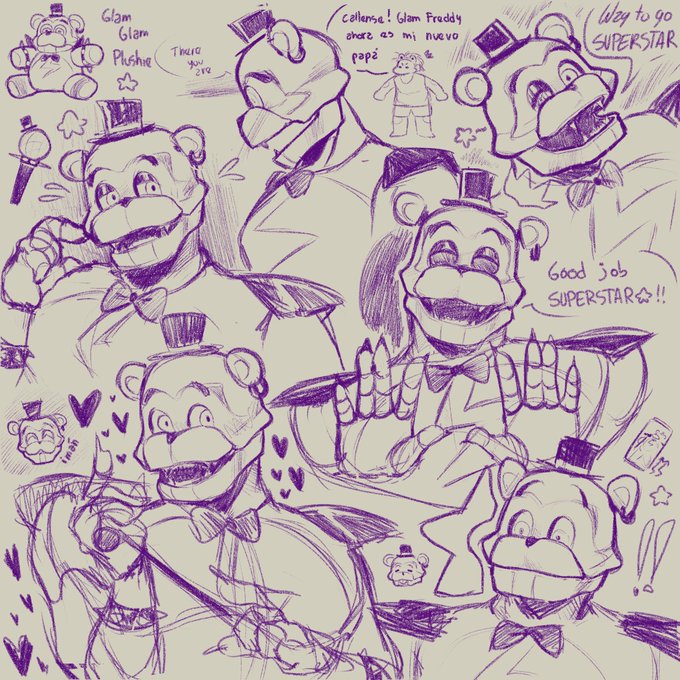 Miren, terminé los sketches de Glam Freddy uwu ✨✨✨ Quise practicar distintas cositas para tener una noción de como dibujarlo a mi manera. Denle amorcito pls QwQ #glamrockfreddy #glamrockfreddyfanart #securitybreachfanart #Freddy #fnaffanart #myart #sketch