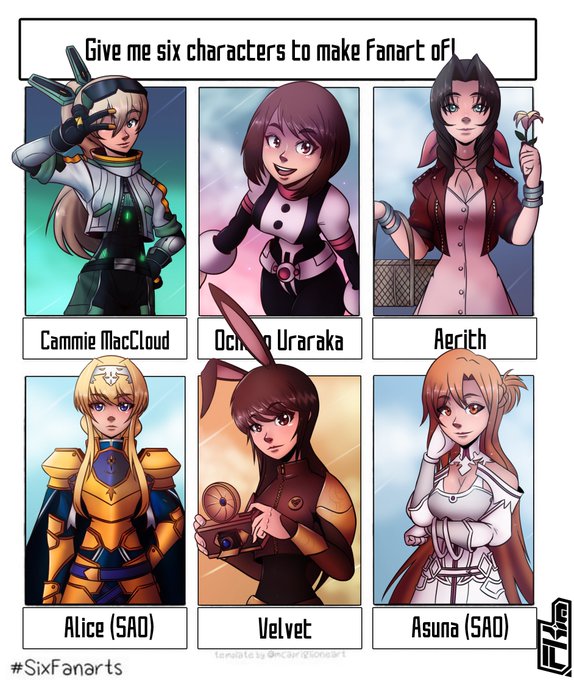 My 2nd set of #SixFanarts ! We got Cammie from #GenLock , that chick from #MyHeroAcademia, Aerith from #FinalFantasy7Remake , Alice & Asuna from #SwordArtOnline and Velvet from #RWBY ! Who's next? @finalfantasyvii @RoosterTeeth @OfficialRWBY @RWBYAmityArena @Caiti #cutiesaturday
