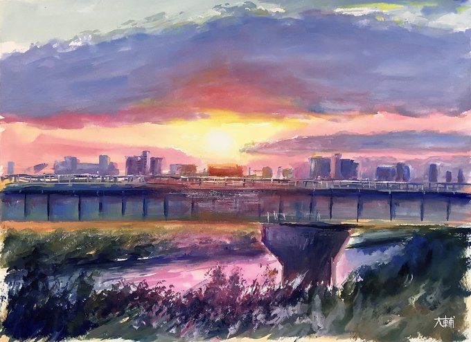 最後の光。 沈む直前の太陽が見せる最後の輝き。 ガッシュで描きました。 久しぶりなので厚く塗る感覚に慣れるのにちょっと時間がかかった。でも楽しかったです。もっとガッシュでの描画も追求しても良いかもと思いました。 #水彩画 #gouache #gouachepainting #ガッシュ #風景画 #landscape