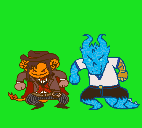 My tiefling gunslinger and his business partner, where they goin #DnDcharacter #Pathfinder2e #gunslinger #inventer #tiefling #dndart #artistsontwitter