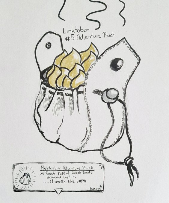 #linktober Day 5 Adventure Pouch Inspiration war der Horde Würfelbeutel. #inktober #inktober2022 #linktober2022 #ink #inking #inkart #InkDrawing #draw #drawing #sketchbook #hobbyartist #adventurepouch #zelda #zeldabreathofthewild #nintendo #nintendoswitch #korok #korokseeds