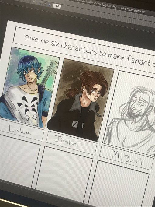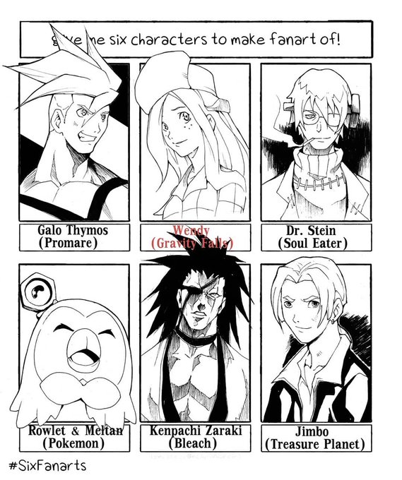 Brandon finished up his #sixfanarts pic!! This was a lot of fun. Landon is hard at work on his right now!! #sixfanart #bleach #kenpachizaraki #gravityfalls #wendy #jimbo #jimhawking #treasureplanet #pokemon #rowlet #meltan #galo #promare #stein #souleater