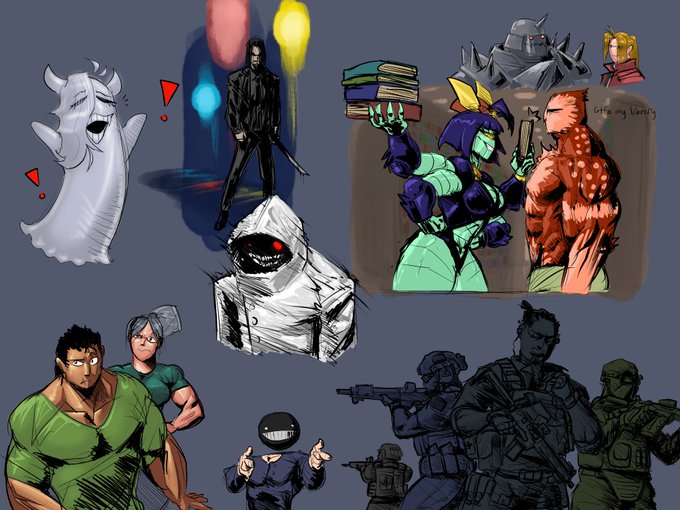 sketches galore ft. @SixbenSoap postin up all spooky like and an honorable mention of Khepera from @MechapenMk2 taking the piss out of Wayne's sacred duties #JohnWick #digitalpainting #DigitalArtist #sketchart