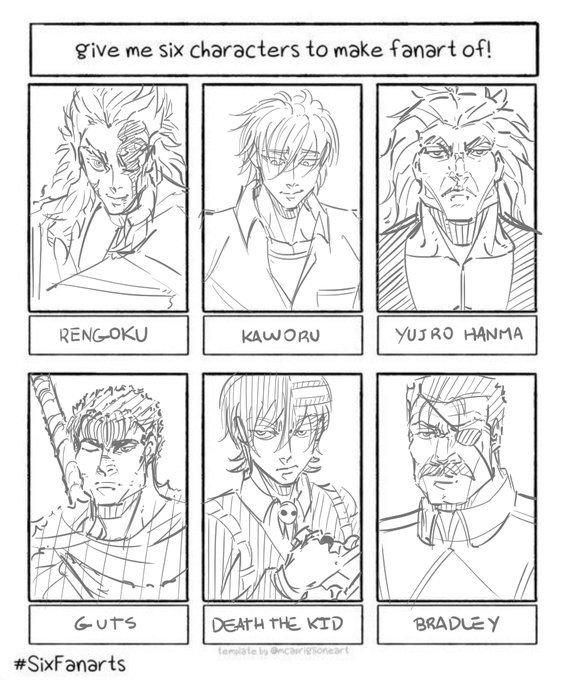 hoje eu fiz o desafio do #SixFanarts, gostei muito dos personagens no meu traço :)) #rengoku #kaworu #yujirohanma #souleater #Berserk #Guts #FullmetalAlchemist