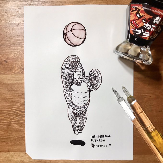インクトーバー2020、9日目のお題は「THROW/投げる」 ゴリラのフリースローを描きました。 インクは、成田本店さんのねぶたブラックです。 ガラスペンはKemmy’s Labo(@kemmys_labo )さんの中字と細字です。 #inktober2020 #inktiber #throw #ガラスペン #成田本店 #kemmyslabo