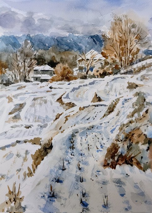 昨日の溶け始めてゆく雪です。照り返しが眩しかった。 #野外スケッチ #透明水彩画 #水彩画 #風景画 #雪 #冬 #早春 #なごりの雪 #写生 #秩父 #横瀬町 #寺坂棚田 #outdoorsketch #watercolour #watercolor #sketch #snow #earlyspring #winter #chicjibu #riceterrace #landscapepainting #aqurelle