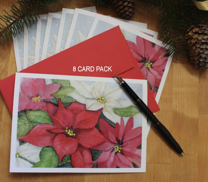 New Design - Poinsettia Christmas Cards #colorful #red #christmascards #watercolor #starflower #christmasflower #greetingcards #mail #stationery #ShopEarly #HolidayShopping #christmasiscoming #TMTInsta #shopsmall #supportsmallbusiness #floralart #cards goimagine.com/holidays/chris…