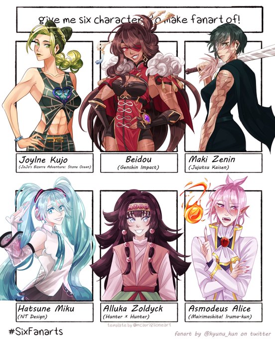 It took forever but I finally did it!! 🥴💖💖 #sixfanarts #MakiZenin #JoylneKujo #Beidou #Miku #Alluka #AsmodeusAlice