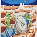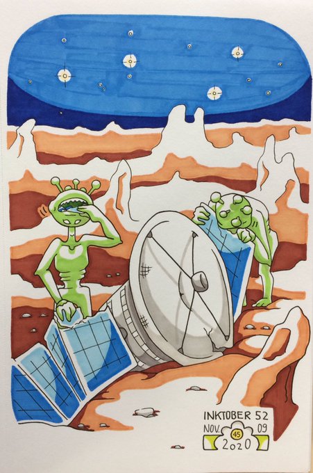 Inktober52 2020! Week 45. From the list made by @mrjakeparker #satellite A satellite fell on Mars and the martians, surprised by this new thing coming from the sky, find it very tasty 😋👽 ! #inktober #inktober2020 #inktober52 #inktober52week45 #space #mars #aliens #martians
