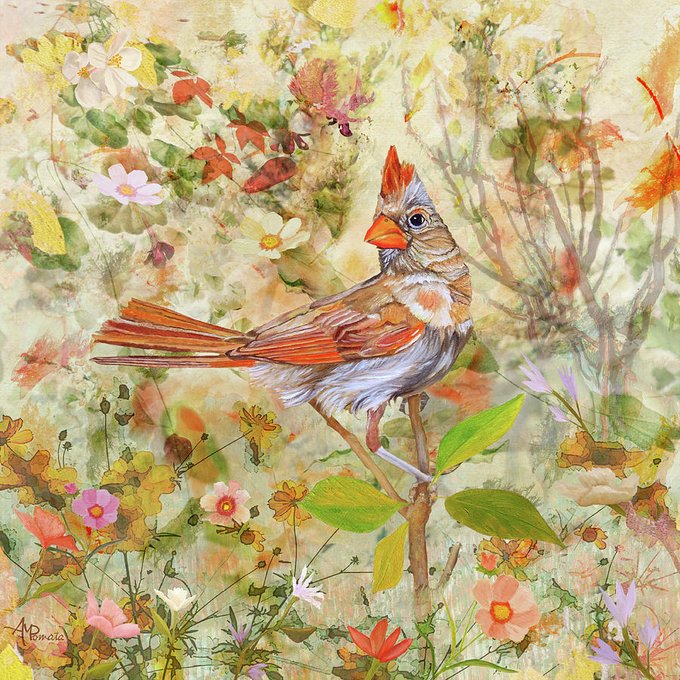 This is my new mixed-media painting "Cardinal Among Flowers", based on a photo by Cindy Treger. You can find very nice prints (& much more) of it here: fineartamerica.com/featured/cardi… #art #painting #mixedmedia #photo #bird #female #cardinal #redbird #flowers #spring #kunst #artprints