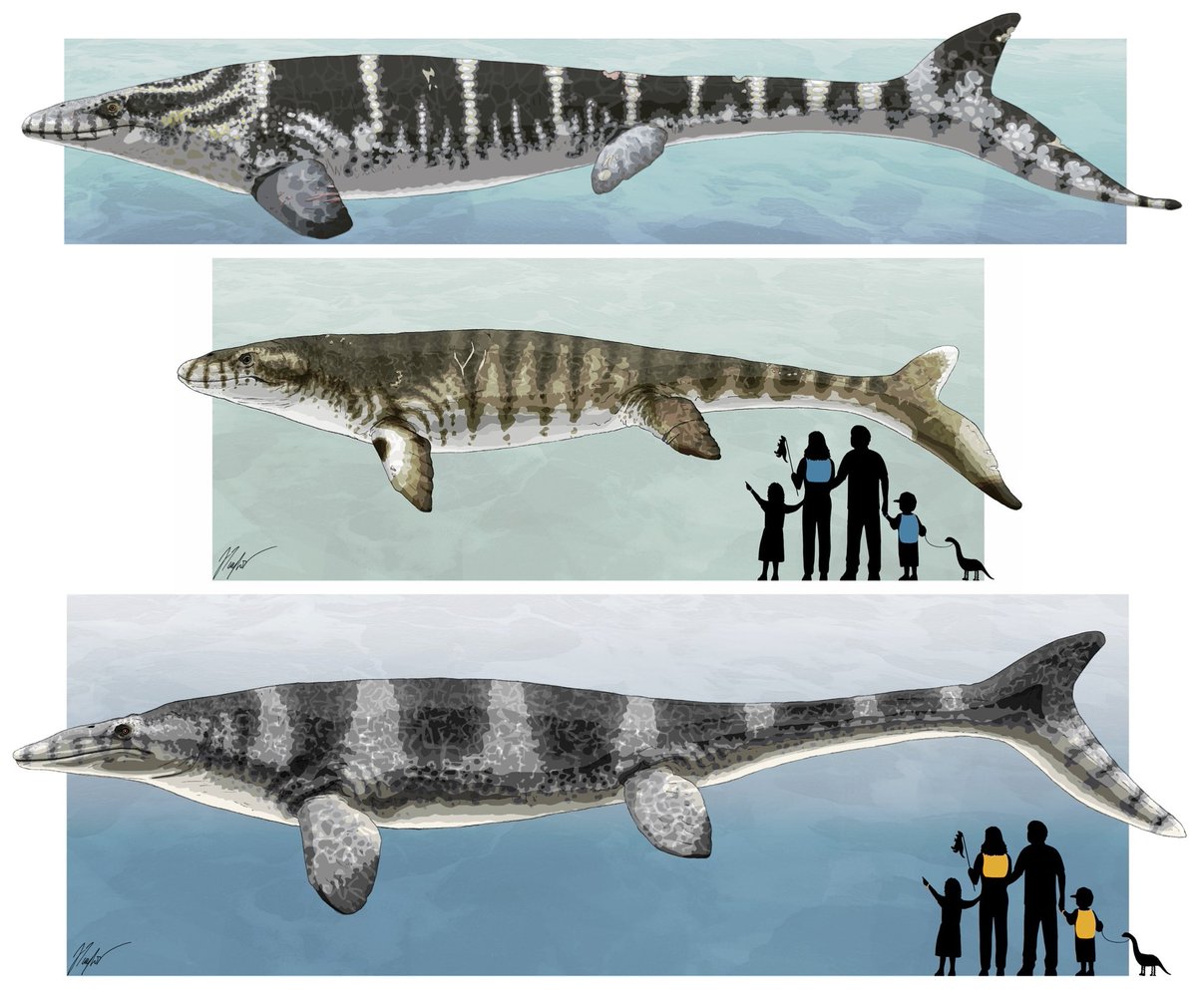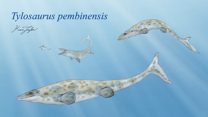 A trio of #Tylosaurus pembinensis, a large mosasaur from late Cretaceous of what is now central Canada, for my next Tales of Kaimere video, which will explore the great diversity of Kaimeran mosasaurs. #MosasaurWeek #Paleoart