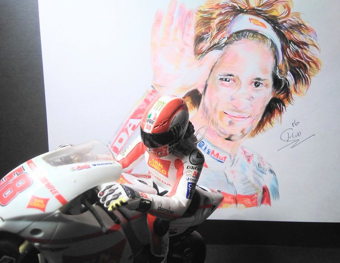 今日は #シモンチェリ の命日です。 個性的なライディング、 #motogp は あまり勉強してないですが、記憶に 残る選手でした。 #marcosimoncelli #Simoncelli #Simoncelli58 #sic #sic58 #moto #semprenelcuore #イラスト #似顔絵 #人物画 #コピック #painting #illustration