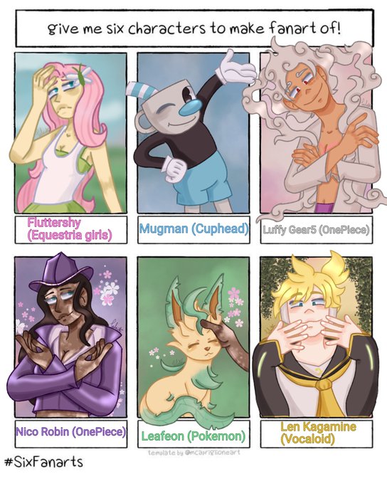 I was able to complete this! I am happy with the result <3 #sixfanarts #sixfanartschallenge #luffy #Fluttershy #mugman #NicoRobin #leafeon #lenKagamine