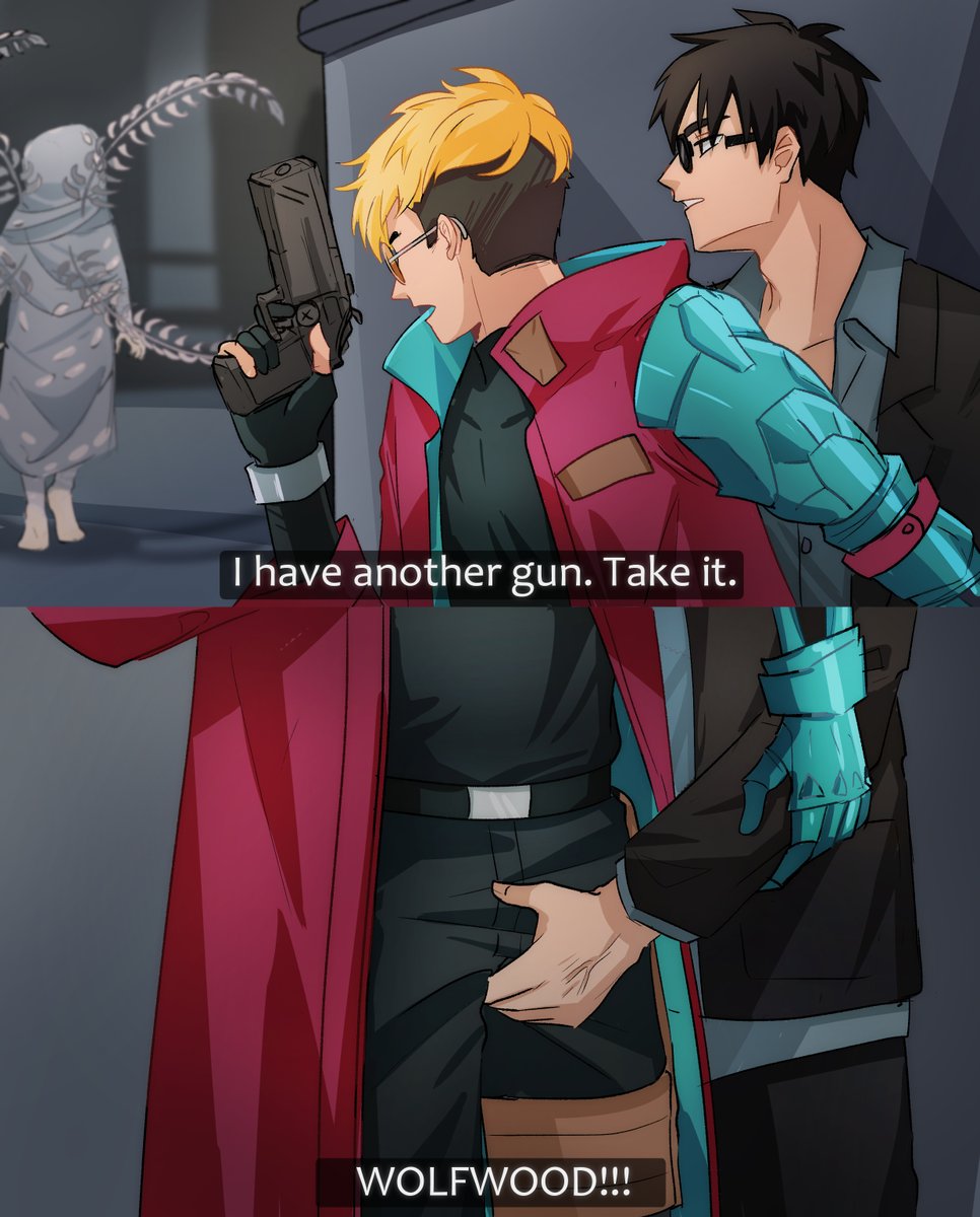 Oops sorry, wrong gun #TRIGUN #TRIGUNSTAMEDE #vashthestampede #NicholasDWolfwood #vashwood