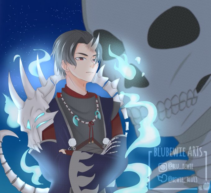 Gashadokuro 💀: Gigantic yokai that bite off lone travellers' heads and drink their blood..though, where does the blood even go-? #obeyme #obeymefanart #obeymemasters #obeymelucifer #obeymeluciferfanart #luciferobeyme