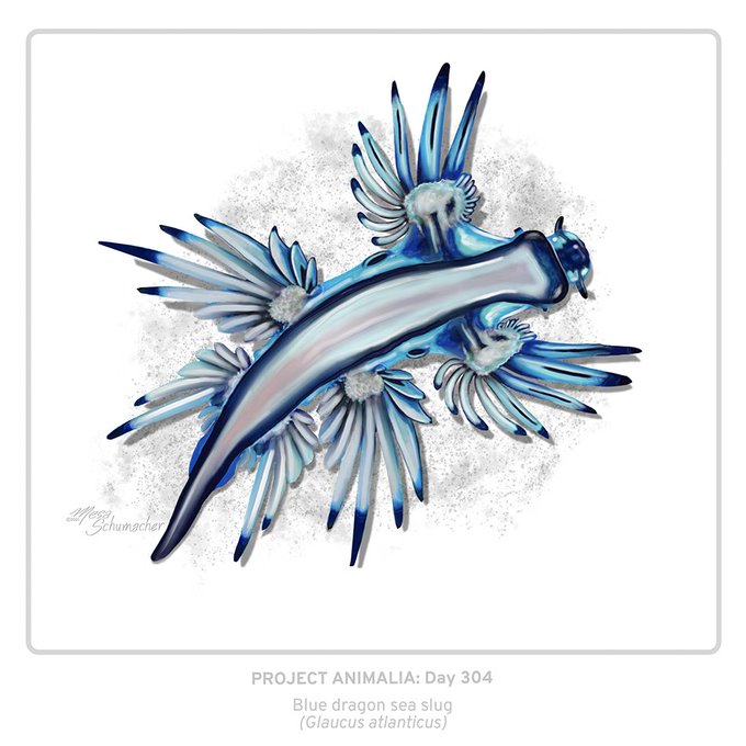 Happy halloween! I spent the day at the beach, so here's a little water "dragon" for you! Project Animalia Day 304:Blue dragon sea slug (Glaucus atlanticus) (Drawing a #sciart #illustration a day in 2021) #wildlifeart #animalart #dailyart #scientificillustration #oceanart