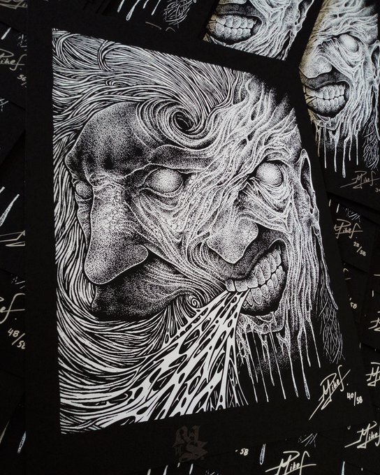 New print just dropped! "Split" was originally created for Slavebreed as cover artwork. This is a limited edition of 58 #artprints, signed & numbered, on 30x40cm (12" x 16"), 320gsm Papago black paper, silkscreen printed by InkSpit Rats! #darkart #penandinkart (store->comments)
