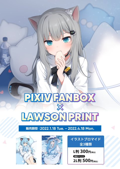 #ローソンプリント #pixivFANBOX コラボキャンペーンが始まりました☃️ 全国のローソン(一部店舗を除く)に設置のマルチコピー機にて、描きおろしを含む3種類のイラストがブロマイド印刷できます!2L判には複製サインが入ってます! fanbox.cc/lawson_print ぜひぜひチェックしてみてください!