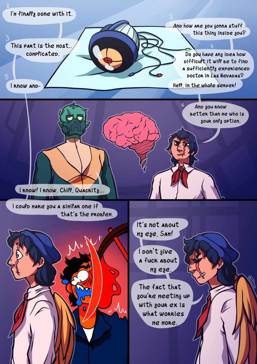 // cw: injury, eye strain; Hippocratic Oath [1/2] Sam could make himself the best mechanical replacement for his lost eye. The hardest part - actually connecting it to the brain. And he's not a doctor. Ponk is. #awesamdudefanart #ponkfanart #quackityfanart #dsmpfanart