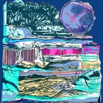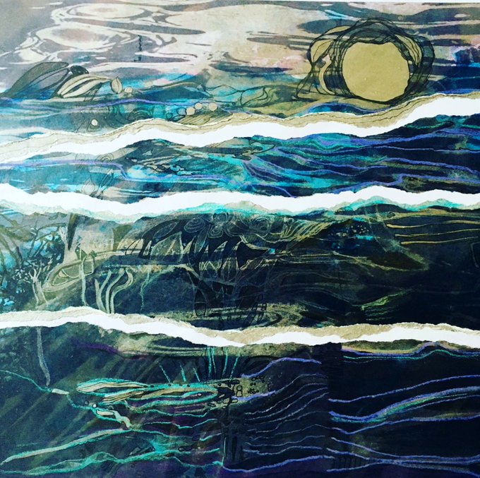 "Long Summer Night" on a cold dull day lets look forward to Summer? here's an overpainted collage made from screen-prints & gold leaf #print #Summer_Holiday #sunlight #swimming #coastline #reflections #holiday #happy #printmaking #art