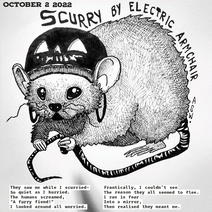 Inktober Day 2: Scurry He's not very scary dammit. Ink on paper by @Flying_armchair -- @inktober @inktober #art #drawing #illustration #ink #inktober2022 #scurry #rats #poetry #writing #halloween #sketchbook