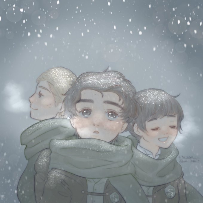 Cold alone. Warm together. 2nd year, when everything was good. #HogwartLegacy #SebastianSallow #OminisGaunt #AnneSallow #Slytherin #Gryffindor #Hufflepuff #Ravenclaw #hogwartslegacyfanart #fanart #ホグワーツレガシー #Procreate