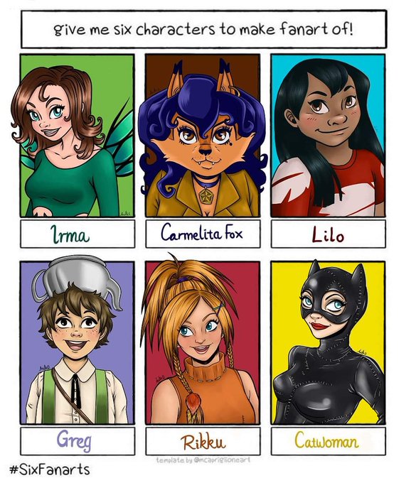 I finished this on Sunday but forgot to post it here. I'm especially pleased with how Rikku and Irma turned out 💙 #SixFanartsChallenge #SixFanarts #Rikku #Catwoman #Lilo #Overthegardenwall #Irma #CarmelitaFox