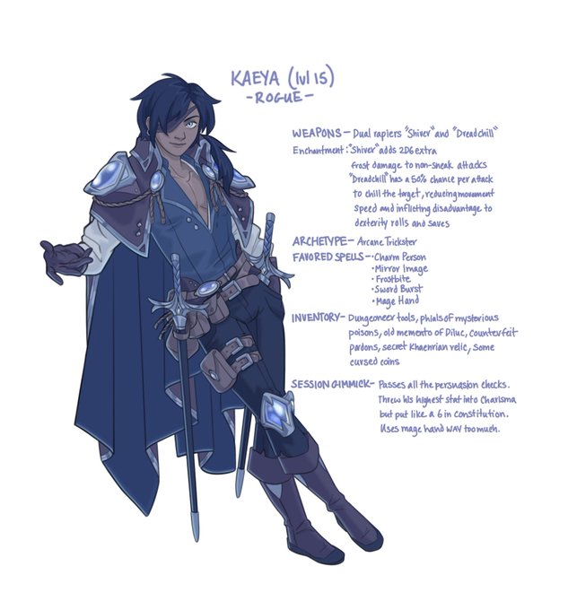 Its #Kaeya ‘s turn. Made him an arcane trickster rogue, my personal favorite subclass. He was particularly fun🤭 #Genshin #genshinimpact #genshinimpactfanart #rogue #DnD #dndart #characterdesign
