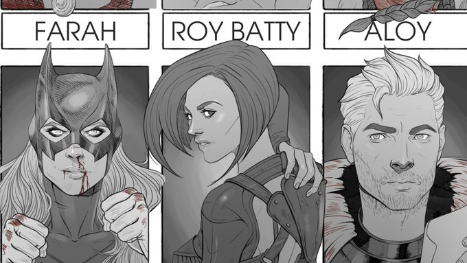 I did not upload here my completed #SixFanartsChallenge ! So, I'm late but here it is ❤️ #fanart #sixfanarts #RoyBatty #Rutgerhauer #Farah #PrinceofPersia #Aloy #HorizonZeroDawn #Batgirl #dccomics #AeonFlux #Cullen #DragonAge #DragonAgeInquisition