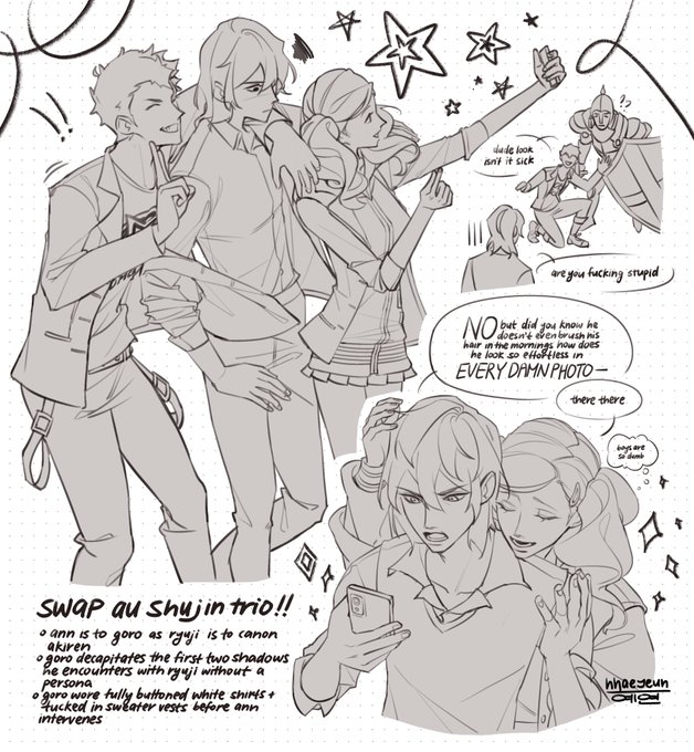 i WISH i had the time to color this but i'll post it now and finish it later 😭 swap au shujin trio my beloved #goroakechi #ryujisakamoto #anntakamaki #persona5