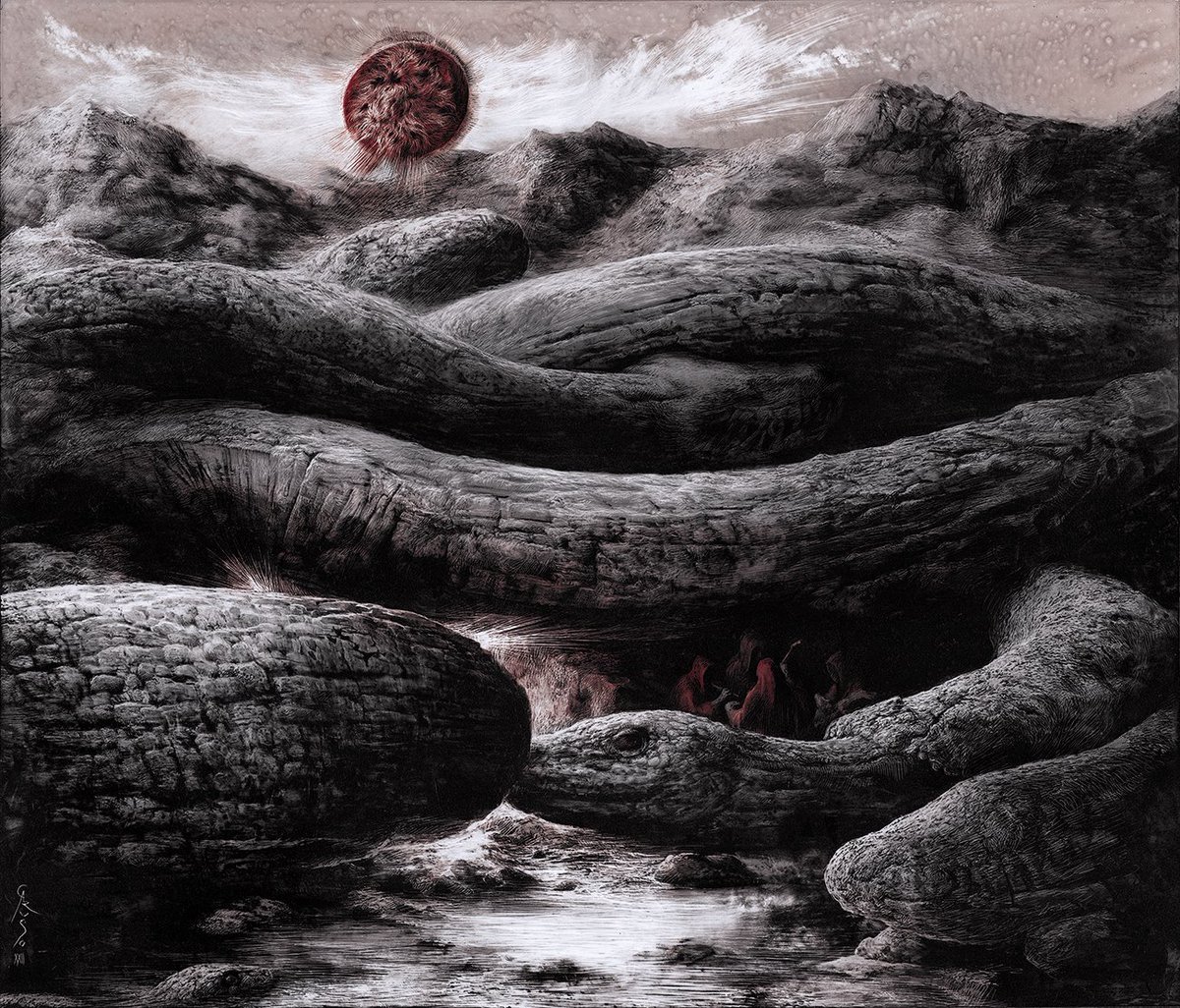 Hatching Sun / Ink & scratch on plastic, color on PS | 42 x 36 cm | 2022 #hatching #sun #ink #tinta #serpent #horrorart #darkart #contemporaryart #conceptart #santiagocaruso