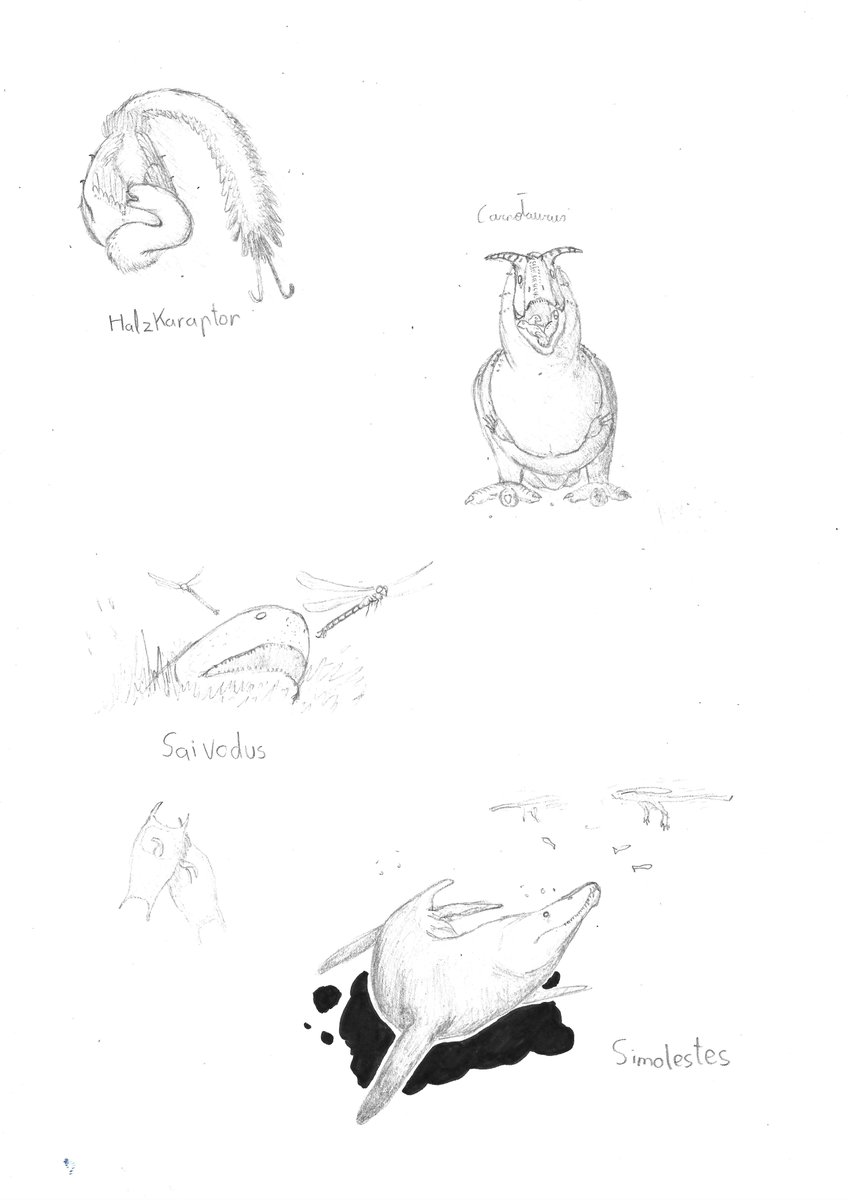 Results of tonight´s #paleostream Halzkaraptor, Carnotaurus, 2 Saivodus (one hunting gryphonfly an other two eggs) and Simolestes #paleoart #sciart #dinosaurs #Halzkaraptor #Carnotarus #shark #saivodus #plesiosaurs #simolestes