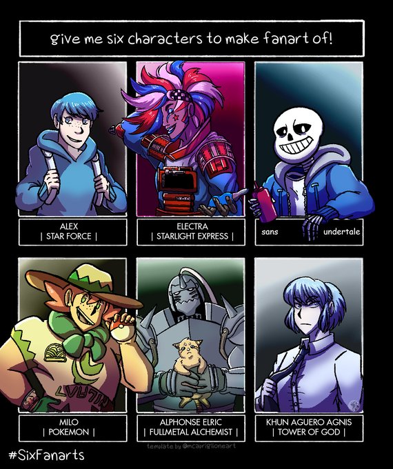 #SixFanarts #sixfanartchallenge #sans #milopokemon #alphonseelric #FullmetalAlchemist #undertale #pokemon #starforce #starlightexpress #Electra I was a little late to the party, but here it is! My Six Fanarts!