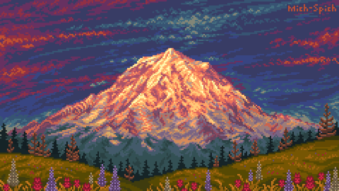 Final landscape piece for the year #pixelart #pixelartist #aseprite #mountain #mtrainier #pnw #Washington #lupine #sunset