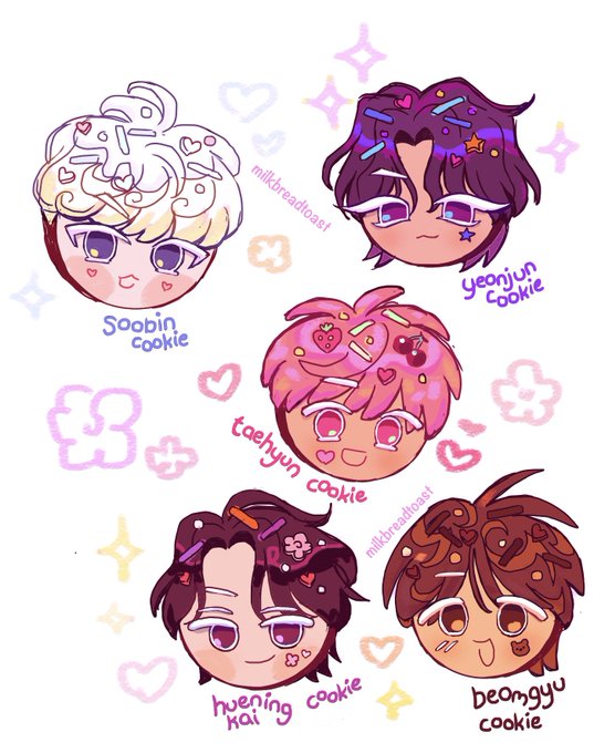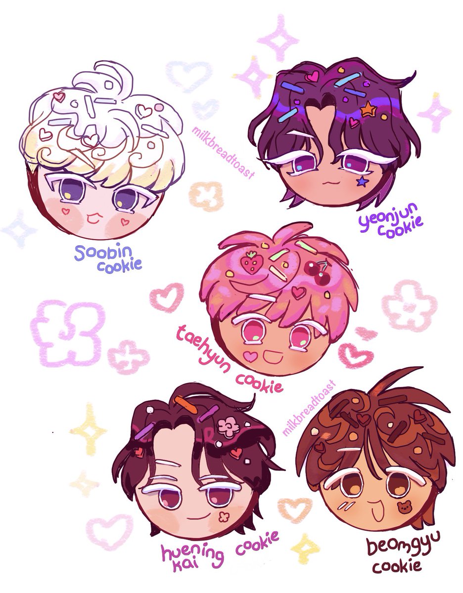 TXT cookies... hopefully it's easy enough to tell who is who🥺 #TXT #TXTfanart #cookierunkingdom #SOOBIN #YEONJUN #BEOMGYU #TAEHYUN #HUENINGKAI