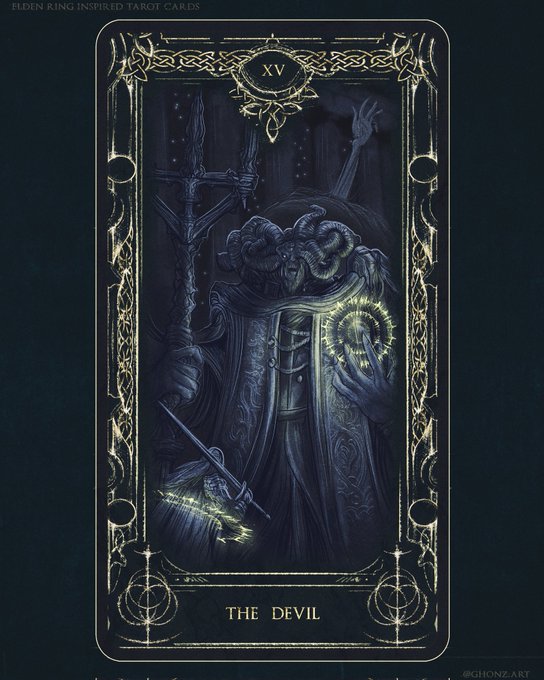 XV. The Devil, 𝐄𝐥𝐝𝐞𝐧 𝐑𝐢𝐧𝐠 Tarot. Mohg, Lord of Blood, he is one of the demigod children of Godfrey and Marika, and the twin brother of Morgott, both of which were Omen. #illustrationart #tarotcards #eldenring #eldenringart #Soulsborne