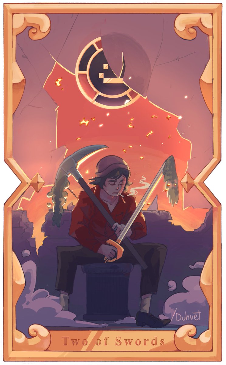 “ Estancado en un camino, incapaz de avanzar” El dos de espadas es un llamado a bajar las defensas ya que no te otorgan la protección que crees. (Mas info abajo) #quackityfanart #Tarotcards