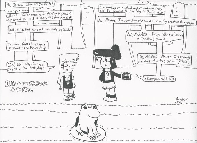 And now for the last January #Inktober52 #comic, we see Jessica and Melanie having a discussion about a: Frog. #inktober52frog #Inktober522022 #inktober2022 #inktober #art #artwork #drawings #artoftheday #penandinkdrawing #minchopigmentliner #thesecretbeauty