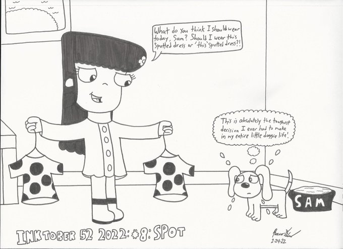 For the last February #comic for #Inktober52 this year, River needs Sam's help choosing what to wear today with today's word: Spot. #inktober52spot #Inktober522022 #inktober2022 #inktober #art #artwork #drawings #artoftheday #penandinkdrawing #minchopigmentliner #thesecretbeauty