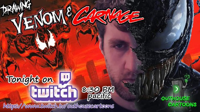 Tonight on Twitch I’ll be drawing Venom and Carnage! Follow and watch tonight at 8:30PST at twitch.tv/outhousecartoo… #Venom #Carnage #Marvel #Comic #Movie #TomHardy #WoodyHarrelson #EddieBrock #CletusCassidy #horror #horrorart #scifi #scifiart #fanart #art #artist #stream #twitch
