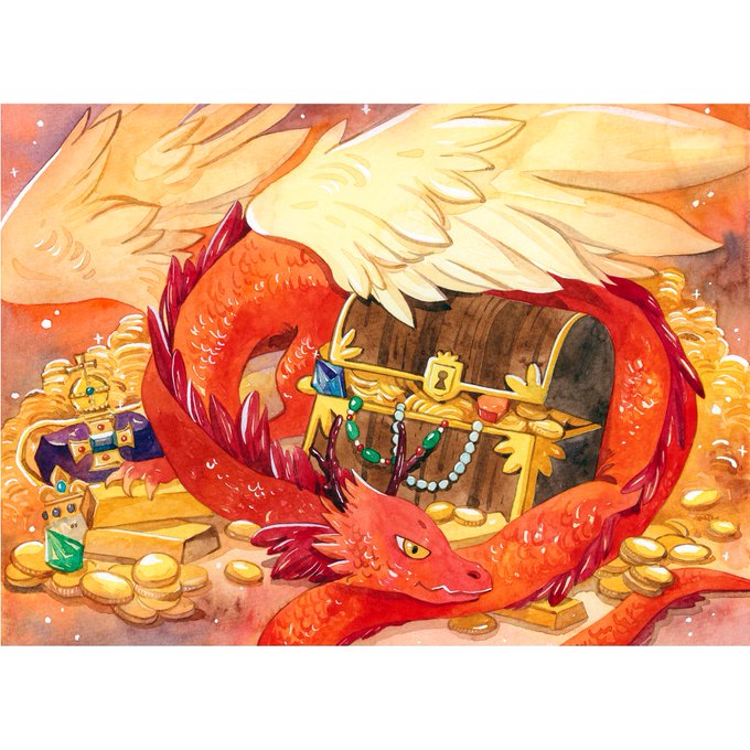 Gold hoarding dragon, commission for @kitsunekon #watercolourart #dragon #fantasy #painting #watercolor #art