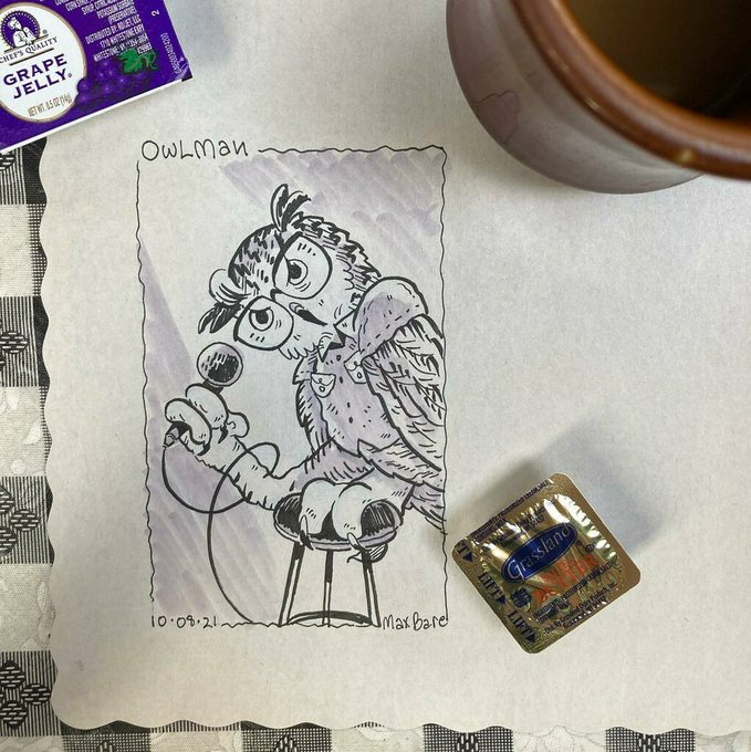 Quick breakfast doodle #folktober 08 🦉 OWLMAN aka OwlMan Maron speakin truth with his broken owl leg . . . . #inktober #owltober #marcmaron #wtf #owls #drawlloween #theowlsarenotwhattheyseem #standupcomedy