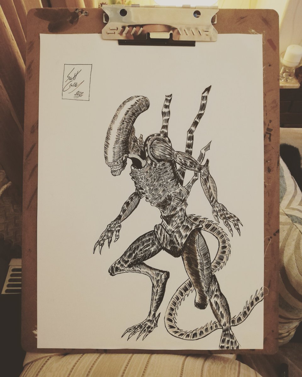 This guy is ready for Comic-Khan and the all-you-can eat buffet. What’s the best all-you-can eat place by the Khan. I’m looking to destroy. #xenomorph #wayshak #aliens #penandink #illustration