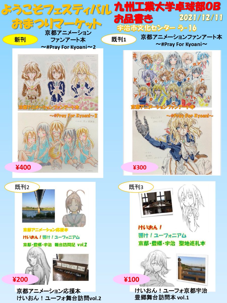 ようこそフェスティバル/おまつりマーケットお品書きです! う-16 九州工業大学卓球部OB、新刊は「京都アニメーションファンアート本〜#prayforkyoani〜2」です!イラスト50枚を詰め込みました✏️ 当日はよろしくお願いします🙇♀️ #youkosofes