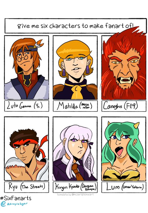 #SixFanarts was a blast and just what I needed to get back in to the spirit of drawing #Ys #MegaMan #FireEmblem #StreetFighter #danganronpa #うる星やつら