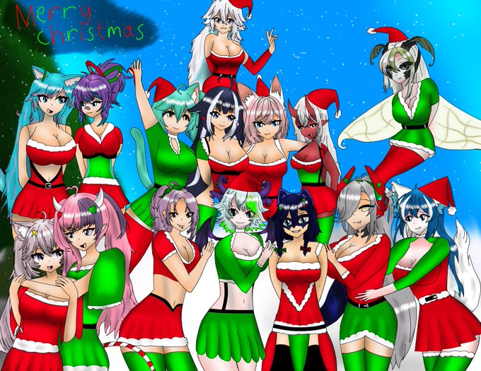 here My big christmas fan art i tried my best so i hope you all enjoy it hopefully next year i can make a better one but i really like this one #rosedoart #yunillust #akumillust #ShylilyArt #veibae #junipart #nyanart #snuffyart #doodlevale #projektmelodyfanart #lichcraft